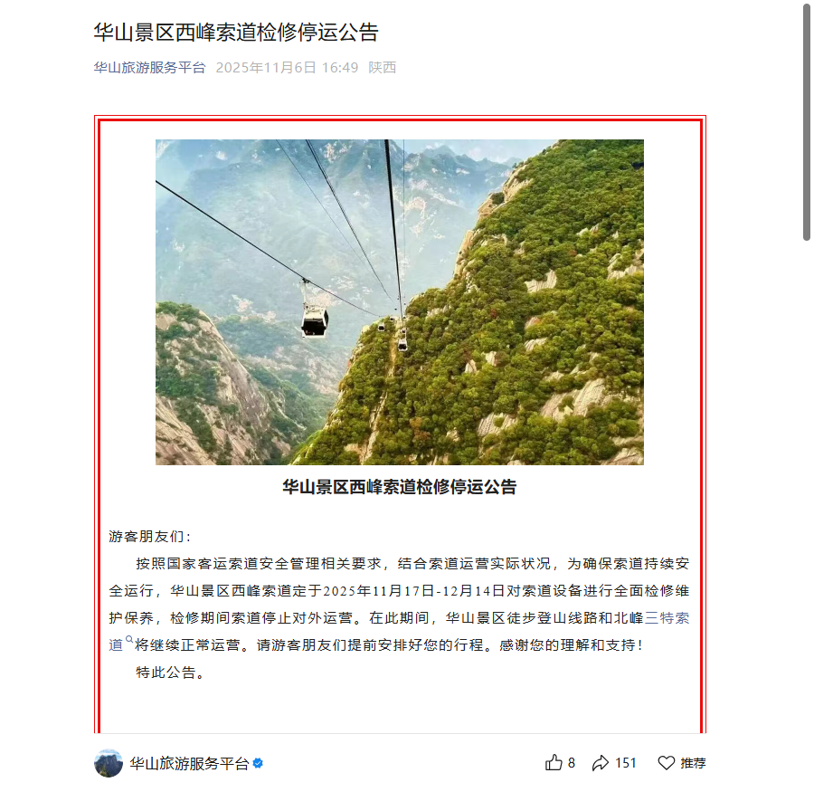 11월17일-12월14일 화산 서봉 케이블카 운행중지